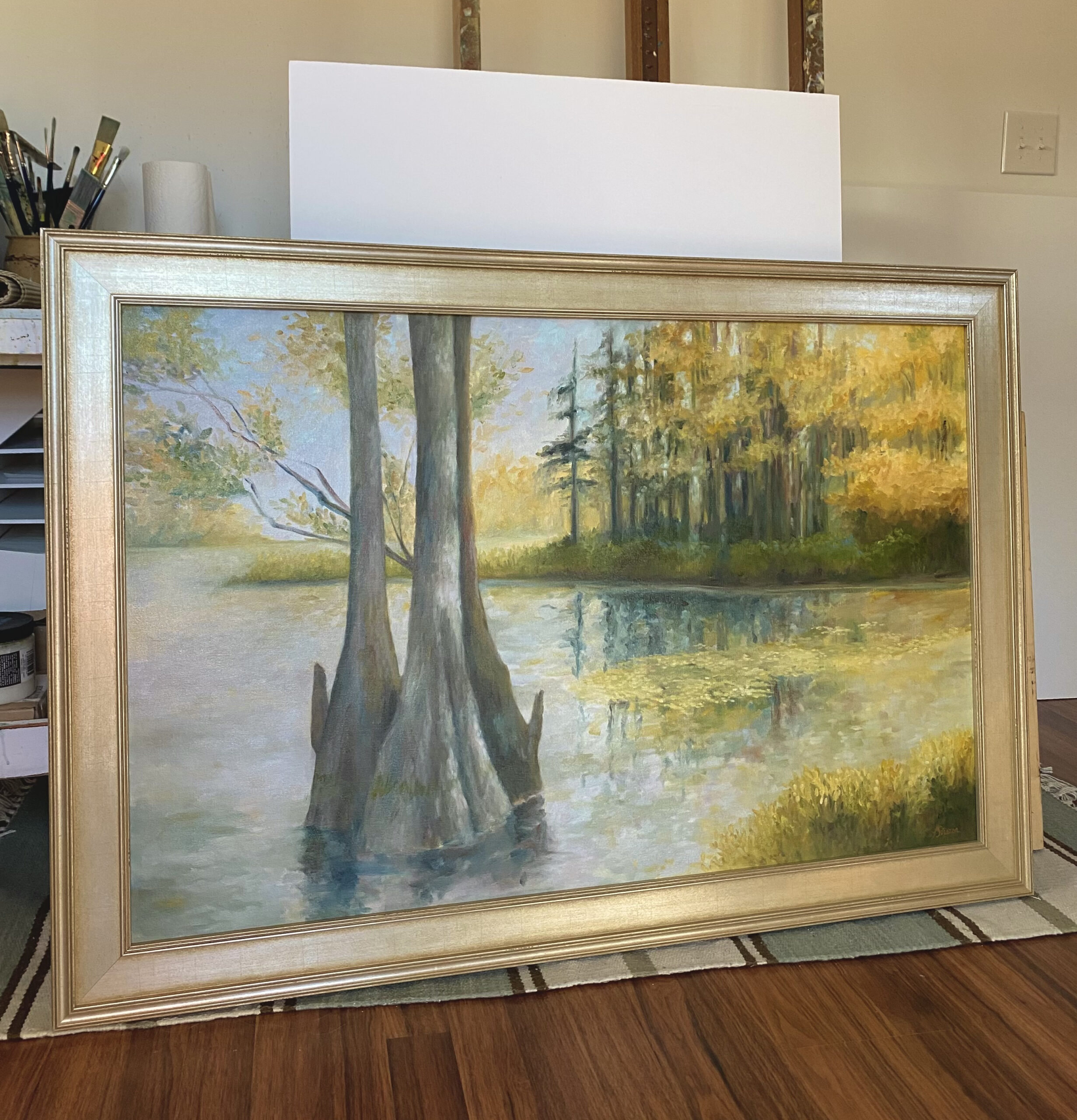 Cypress in Autumn Cypress in Autumn Canvas 40 x 26″ Framed (Outside Dimension) 45.5 x 31.5″ Oil on canvas